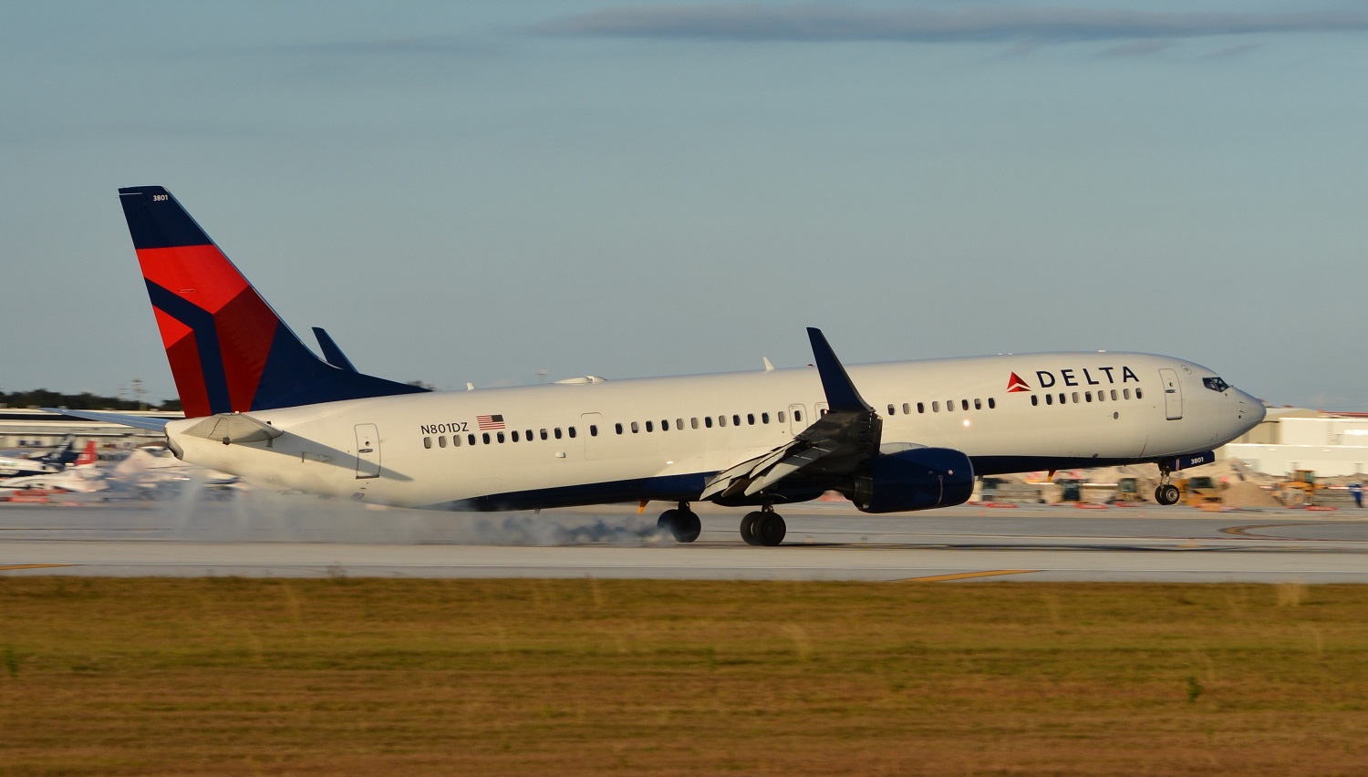 Delta Air Lines with Boeing 737-900ER while touching down runway in a landing phase attempt. This photo taken by Luis Linares in a very accurate moment, as landing gear touched the asphalt of runway.